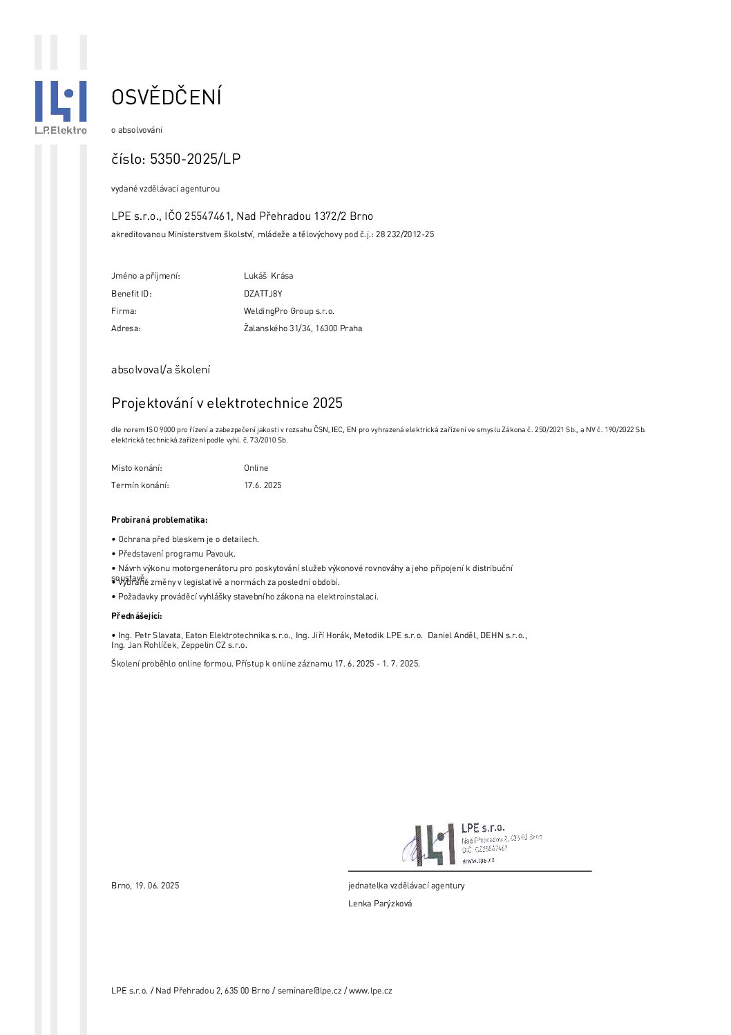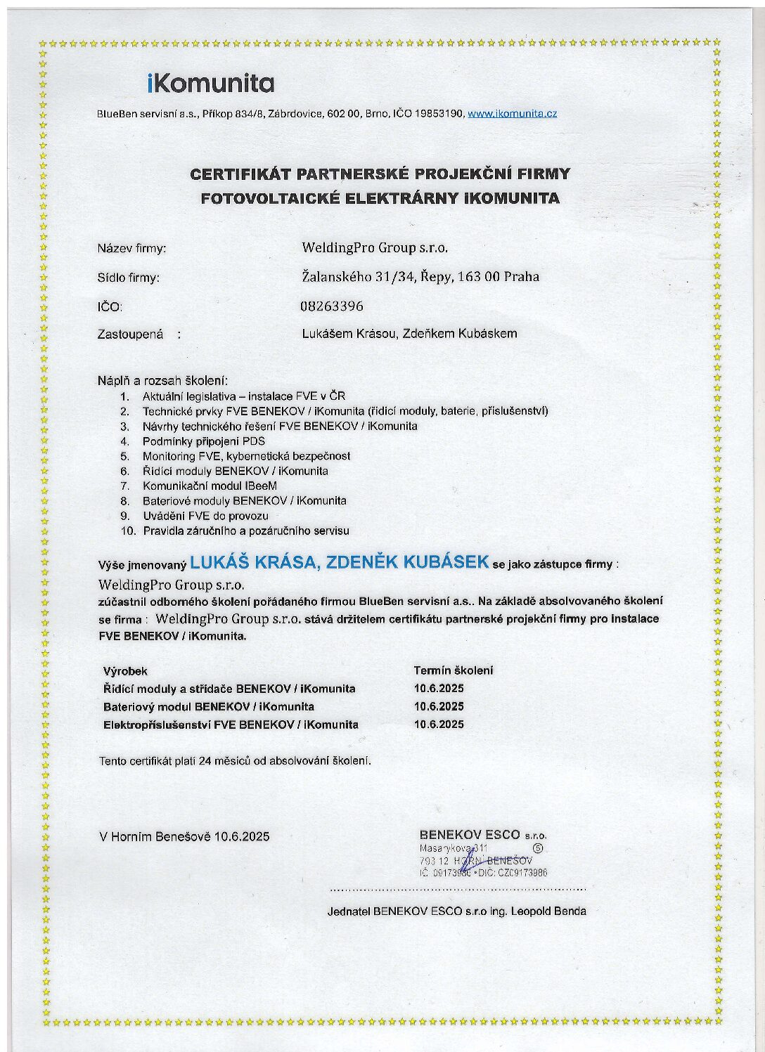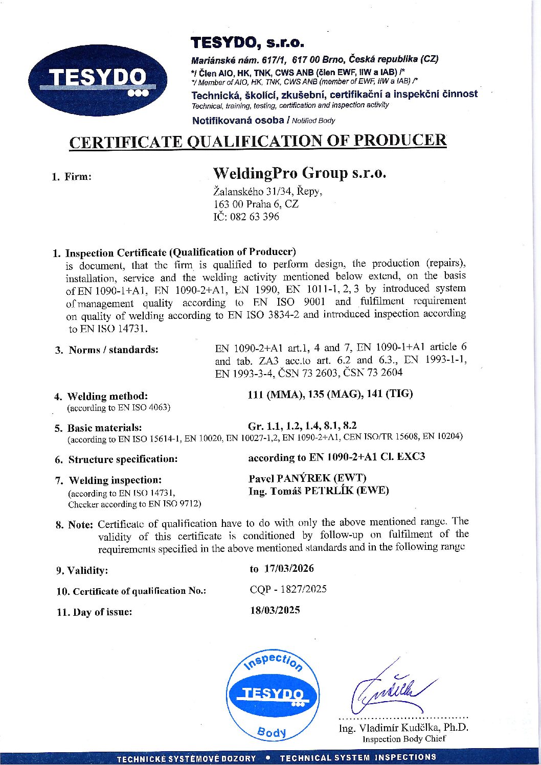 Vítejte na stránce věnované našim certifikacím a potvrzením kvality. Ve společnosti WeldingPro Group se zavazujeme k nejvyšším standardům v oblasti energetiky. Naše certifikáty, včetně mezinárodně uznávaného ISO, potvrzují, že naše procesy a služby splňují přísné normy kvality a bezpečnosti. Prohlédněte si naše certifikáty a přesvědčte se o naší odbornosti a závazku k excelenci.